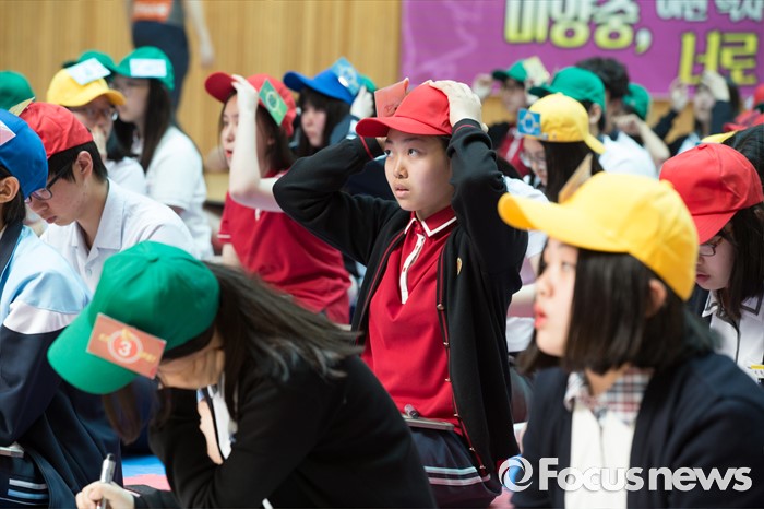 (서울=포커스뉴스) 24일 오후 서울 강북구 신일중학교 체육관에서 열린 근현대사기념관 개관 기념 '역사 골든벨'에 참석한 학생들이 본선 골든벨 퀴즈를 풀고 있다.