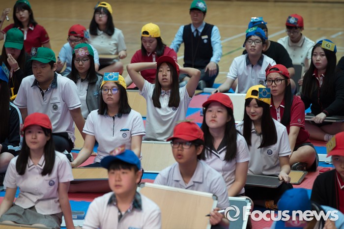 (서울=포커스뉴스) 24일 오후 서울 강북구 신일중학교 체육관에서 열린 근현대사기념관 개관 기념 '역사 골든벨'에 참석한 학생들이 본선 골든벨 퀴즈를 풀고 있다.