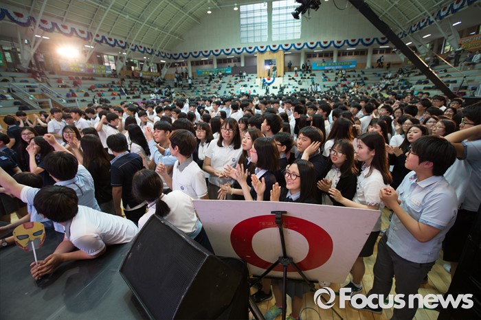 (서울=포커스뉴스) 24일 오후 서울 강북구 신일중학교 체육관에서 열린 근현대사기념관 개관 기념 '역사 골든벨'에 참석한 학생들이 예선전 O.X 퀴즈를 풀고 있다.