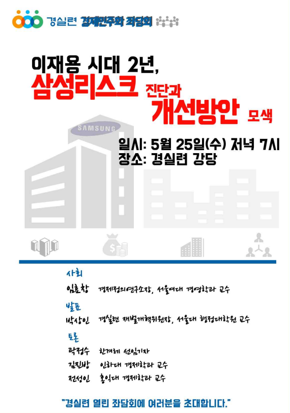 (서울=포커스뉴스) 경제정의실천시민연합(경실련)이 오는 25일 오후 7시 서울 종로구 경실련 건물 강당에서 '삼성리스크 진단과 개선방안 모색'이라는 주제로 경제민주화 좌담회를 개최한다.