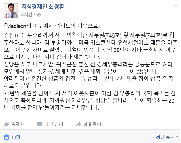 최 의원은 "정당은 서로 다르지만 위스콘신 출신 전 경제부총리라는 공통분모로 김 전 부총리와 여러 모임에서 만나왔다"면서 "30년 세월을 넘어 다시 저와 이웃사촌이 되신 김 부총리의 국회 복귀를 진심으로 축하드린다"고 말했다.
