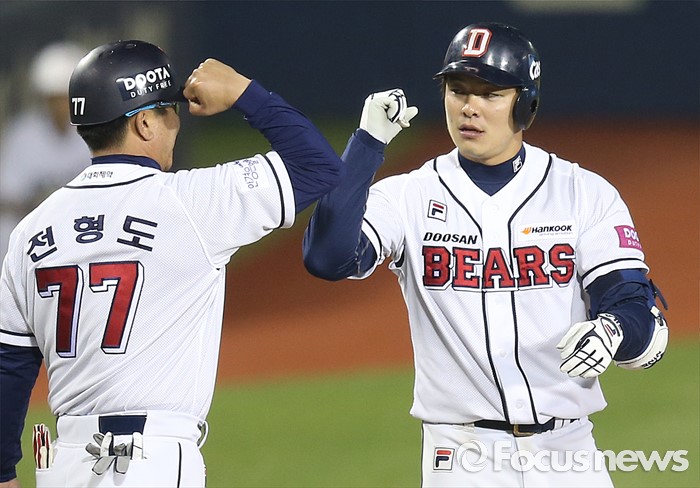 (서울=포커스뉴스) 24일 서울 잠실구장에서 열린 2016프로야구 kt-두산 경기 7회말 무사 1,2루에서 역전 3루타를 친 두산 민병헌이 전형도 코치와 팔꿈치응 부딪치며 기뻐하고 있다.