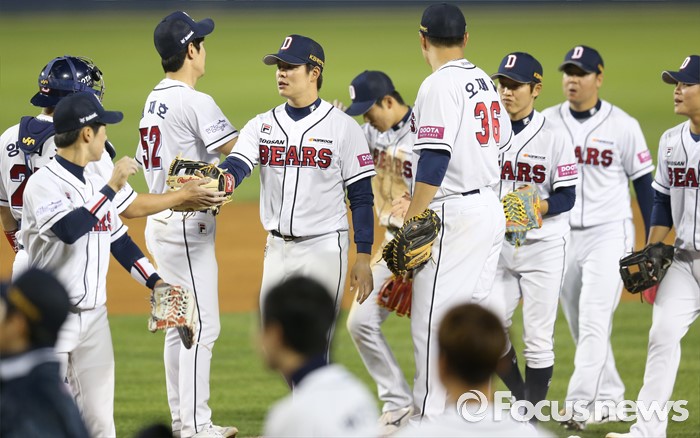 (서울=포커스뉴스) 24일 서울 잠실구장에서 열린 2016프로야구 kt-두산 경기에서 kt와 역전 재역전하는 승부 끝에 승리해 시즌 30승에 선착한 두산 선수들이 마운드에 모여 기쁨을 함께하고 있다.