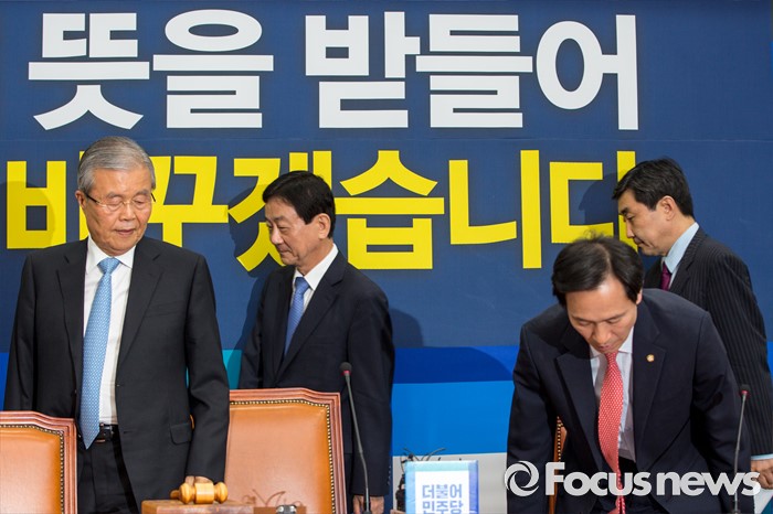 (서울=포커스뉴스) 김종인(왼쪽) 더불어민주당 비상대책위 대표와 우상호(오른쪽 두 번째) 더불어민주당 원내대표가 25일 오전 서울 여의도 국회에서 열린 비상대책위원회의에 참석하기 위해 회의실로 들어서고 있다.