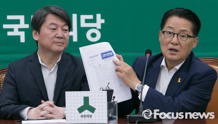 (서울=포커스뉴스) 25일 오전 서울 여의도 국회에서 열린 국민의당 최고위원회의에 참석한 박지원 원내대표가 17대, 18대 국회에서 의결한 법안 시행령 관련 관보를 들고 발언하고 있다. 왼쪽은 안철수 상임공동대표.