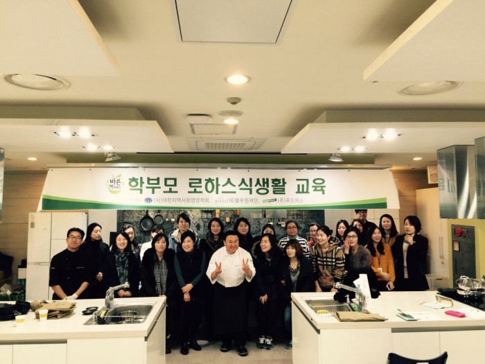 어린이들의 청소 습관을 길러주는 환경교육 프로젝트 '바른청소교실'도 지난해에 이어 올해도 진행한다. '바른청소교실'은 어린이에게 청소를 '노동'이 아닌 '놀이'라는 긍정적인 인식을 심어주고, 환경과 이웃까지 생각하는 의식을 형성할 수 있도록 해주는 교육이다.지난해 12월9일 강남 수서 소재 풀무원 풀스키친에서 열린 학부모 대상 '로하스식생활 교육'에서 참석자들이 교육 후 기념촬영하고 있다.<사진제공=풀무원>