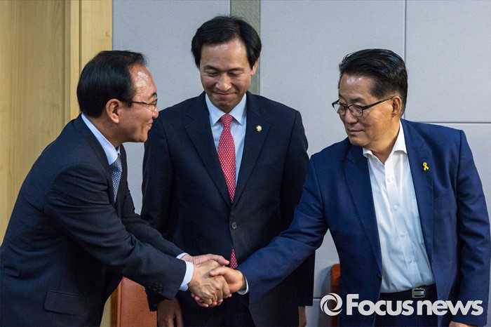 | △ 악수하는 박지원 원내대표-노회찬 원내대표 |