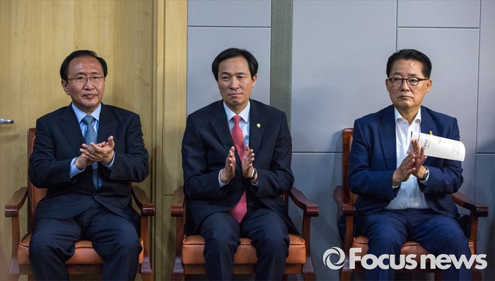 (서울=포커스뉴스) 25일 오전 서울 여의도 국회의원회관에서 열린 '공영언론 지배구조 개선 위한 20대 국회의 역할과 과제 토론회'에 야3당 원내대표가 참석해 박수를 치고 있다. 왼쪽부터 노회찬 정의당 원내대표, 우상호 더불어민주당 원내대표, 박지원 국민의당 원내대표.