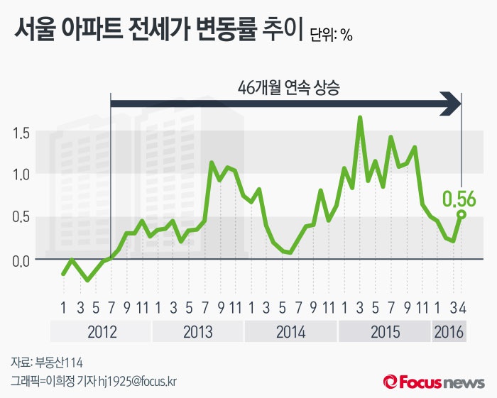 (서울=포커스뉴스) 25일 부동산114에 따르면 서울 아파트 전셋값은 지난 2012년 7월부터 올해 4월까지 46개월 연속 오름세가 이어졌다. 지난해 4월까지 서울 아파트 전세가격은 1.7% 올랐으나 올해는 0.56% 상승에 그쳤다.