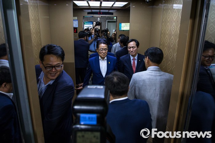 (서울=포커스뉴스) 우상호 더불어민주당 원내대표와 박지원 국민의당 원내대표가 25일 오전 서울 여의도 국회의원회관에서 열린 '공영언론 지배구조 개선 위한 20대 국회의 역할과 과제 토론회'에 참석해 인사말을 마친 뒤 승강기에 탑승 하고 있다.