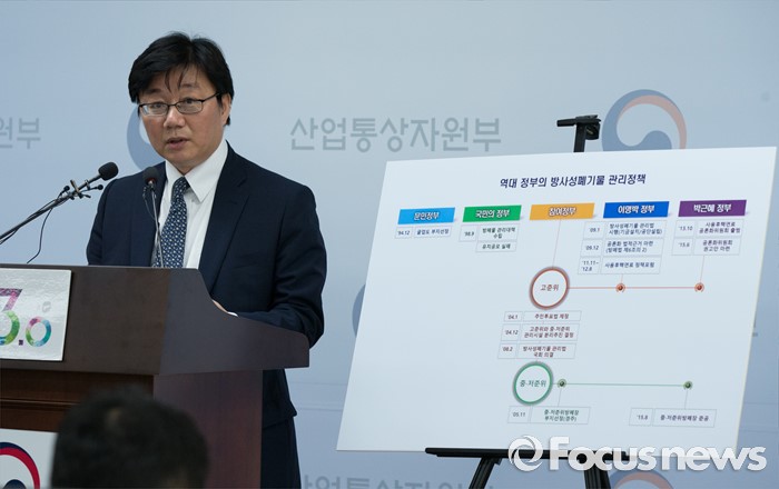 (세종=포커스뉴스) 채희봉 산업통상자원부 에너지자원실장이 25일 오전 세종시 정부세종청사 산업통상자원부 기자실에서 고준위방사성폐기물 관리 기본계획안에 대한 설명을 하고 있다.