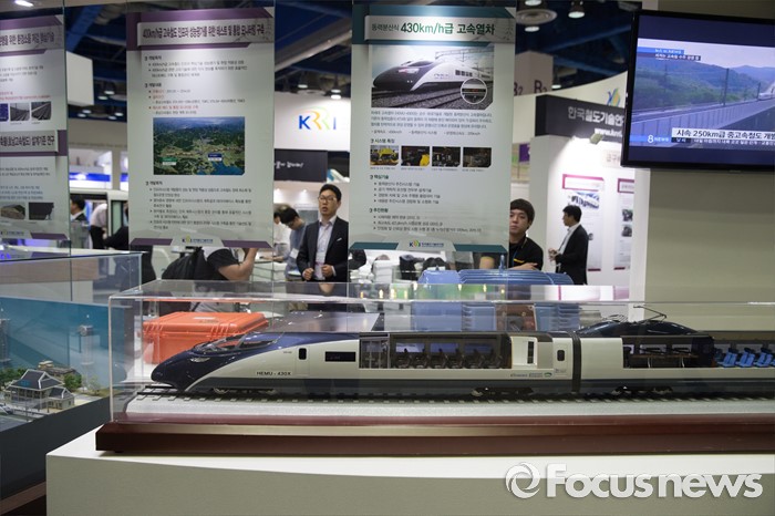 (서울=포커스뉴스) 25일 오전 서울 강남구 코엑스에서 열린 국토교통부 주최'2016 국토교통기술대전' 에 참여한 관계자들이 한국철도기술연구원 부스를 샆펴보고 있다.