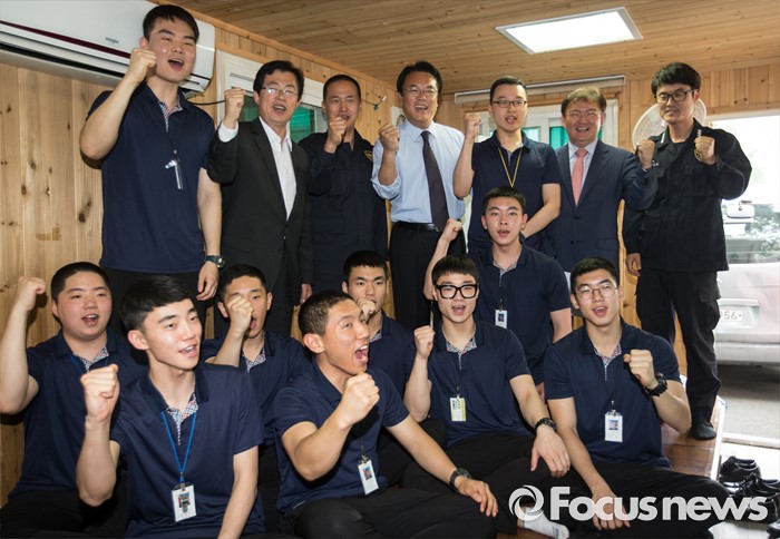 (서울=포커스뉴스) 정진석 새누리당 원내대표가 25일 오후 서울 여의도 새누리당 당사에서 당사 경비 및 의경들을 격려한 후 기념사진을 찍고 있다.