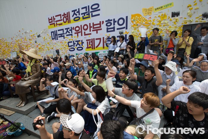(서울=포커스뉴스) 25일 오전 서울 종로구 옛 일본대사관 앞에서 열린 '제1232차 일본군 위안부 문제해결을 위한 정기 수요시위'에 참석한 학생들이 구호를 외치고 있다.