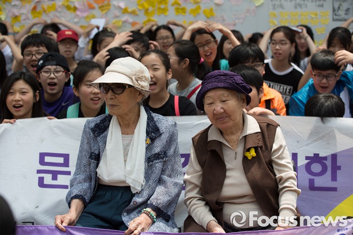 (서울=포커스뉴스) 25일 오전 서울 종로구 옛 일본대사관 앞에서 열린 '제1232차 일본군 위안부 문제해결을 위한 정기 수요시위'에 참석한 학생들이 김복동(왼쪽), 길원옥 할머니에게 하트를 보내고 있다.