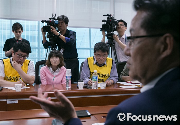(서울=포커스뉴스) 박지원(오른쪽) 국민의당 원내대표가 25일 오후 서울 여의도 국회 의원회관에서 가습기 살균제 피해자와 가족모임과의 면담을 하고 있다.