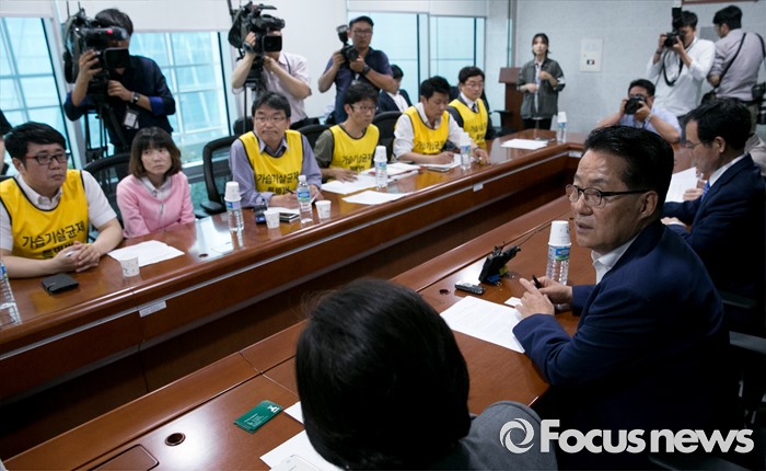 (서울=포커스뉴스) 박지원 국민의당 원내대표가 25일 오후 서울 여의도 국회 의원회관에서 가습기 살균제 피해자와 가족모임과의 면담을 하고 있다.