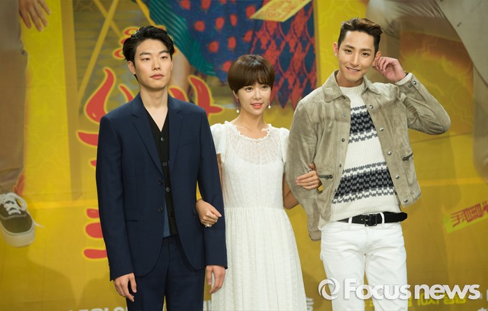 (서울=포커스뉴스) 25일 오후 서울 마포구 MBC상암사옥에서 열린 MBC 수목드라마 '운빨로맨스' 제작발표회에 참석한 배우 류준열(왼쪽부터), 황정음, 이수혁이 포토타임을 갖고 있다.