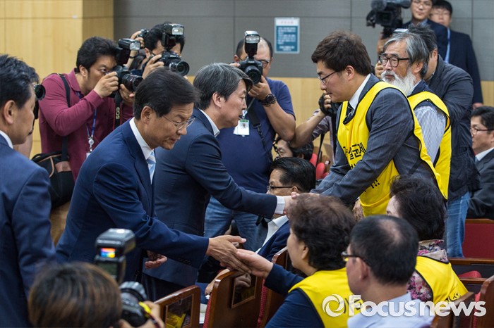 (서울=포커스뉴스) 안철수(왼쪽 세 번째) 국민의당 상임공동대표와 천정배(왼쪽 두 번째) 국민의당 공동대표가 25일 오후 서울 여의도 국회의원회관에서 열린 '제조물 책임법 문제점 개선방안 토론회'에 참석한 가습기 살균제 피해 가족들과 인사 하고 있다.
