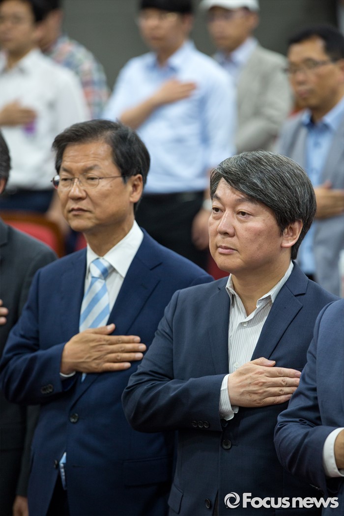 (서울=포커스뉴스) 안철수(오른쪽) 국민의당 상임공동대표와 천정배 국민의당 공동대표가 25일 오후 서울 여의도 국회의원회관에서 열린 '제조물 책임법 문제점 개선방안 토론회'에 참석해 국민의례 하고 있다.