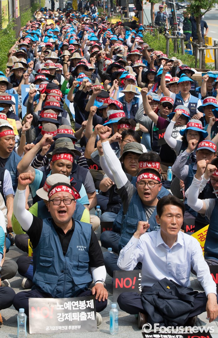 (세종=포커스뉴스) 25일 오후 세종시 정부세종청사 기획재정부 앞에서 공기업정책연대 구성원들이 성과연봉제 저지 및 강제퇴출제 반대 수요집회를 열고 성과연봉제 반대하는 구호를 외치고 있다.