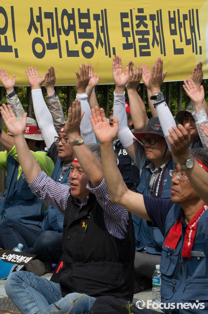 (세종=포커스뉴스) 25일 오후 세종시 정부세종청사 기획재정부 앞에서 공기업정책연대 구성원들이 성과연봉제 저지 및 강제퇴출제 반대 수요집회를 열고 성과연봉제 반대하는 구호를 외치고 있다.