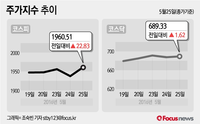 (서울=포커스뉴스) 25일 코스피지수는 전날 보다 1.18%(22.83포인트) 오른 1960.51에 장을 마쳤다. 코스닥지수는 전일 대비 0.24%(1.62포인트) 오른 689.33에 마감했다.