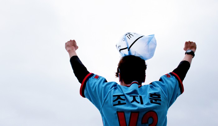 주황색 봉지가 아닌 하늘색 봉지를 사용하는 '하늘색 봉다리 응원'은 25일 울산 문수구장에서 열리는 롯데와 LG와의 홈경기에 첫 선을 보인다. 롯데 구단은 "올시즌 새로 설치한 사직구장 외관 LED 조명과 함께 진행하는 컬러마케팅의 일환이다. 챔피언스데이와 유니세프데이에 입는 선수단 특별 유니폼이 푸른 계열임을 감안해 팬들의 응원에 더욱 활기를 불어넣고자 제작했다. 사직구장 특유의 봉다리 응원이 한층 더 업그레이드 될 것으로 기대하고 있다"고 설명했다.프로야구 롯데가 25일 울산 문수구장에서 열리는 LG와의 경기에 '하늘색 봉다리 응원'을 처음 선보인다. 사진은 롯데 조지훈 응원단장이 하늘색 봉지를 머리에 쓰고 포즈를 취한 모습. <사진제공=롯데 자이언츠>