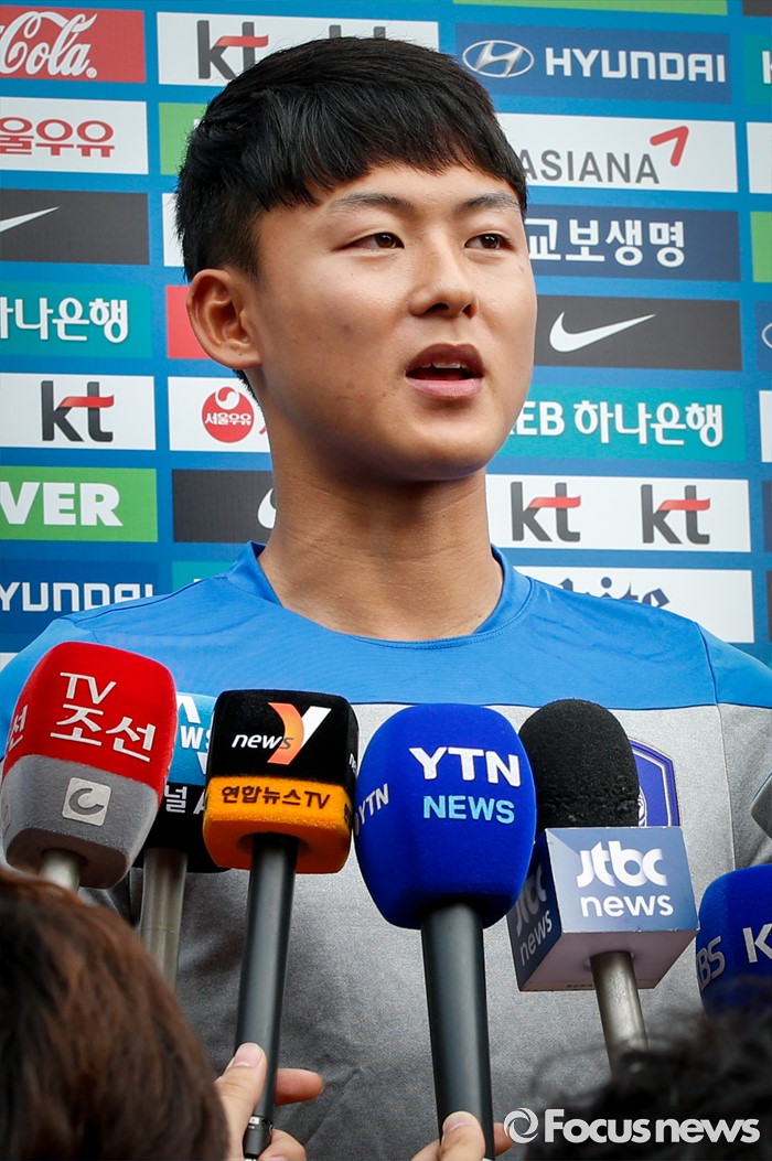 (파주=포커스뉴스) 이승우(18, 바르셀로나 후베닐A)가 25일 오후 경기도 파주 NFC에서 진행된 U-18(18세 이하) 축구대표팀 소집 훈련에 앞서 취재진의 질문에 답하고 있다.