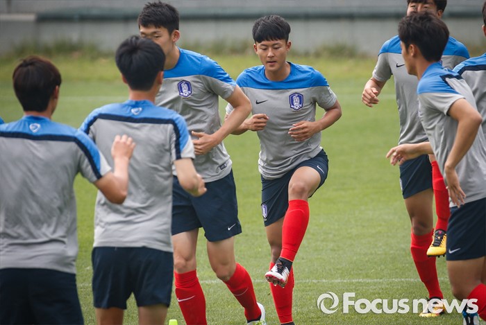 (파주=포커스뉴스) 이승우(18, 바르셀로나 후베닐A)가 25일 오후 경기도 파주 NFC에서 잉글랜드 U18(18세 이하) 대표팀과의 친선전을 앞두고 축구대표팀 선수들과 소집 훈련에 임하고 있다.