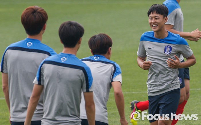 (파주=포커스뉴스) 이승우(18, 바르셀로나 후베닐A)가 25일 오후 경기도 파주 NFC에서 잉글랜드 U18(18세 이하) 대표팀과의 친선전을 앞두고 축구대표팀 선수들과 소집 훈련에 임하고 있다.