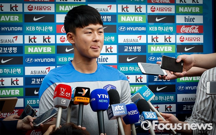 (파주=포커스뉴스) 이승우(18, 바르셀로나 후베닐A)가 25일 오후 경기도 파주 NFC에서 진행된 U-18(18세 이하) 축구대표팀 소집 훈련에 앞서 취재진의 질문에 답하고 있다.