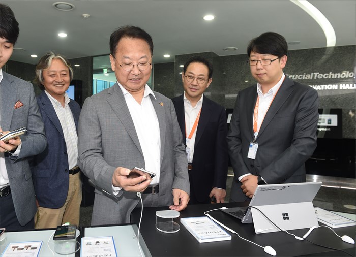 (성남=포커스뉴스) 유일호 부총리 겸 기획재정부 장관이 25일 벤처.창업 관련 현장방문의 일환으로 경기도 판교 테크노벨리 소재 (주)크루셜텍을 방문, 관계자로부터 제품과 연구시설의 설명을 듣고 있다. <사진제공=기획재정부>