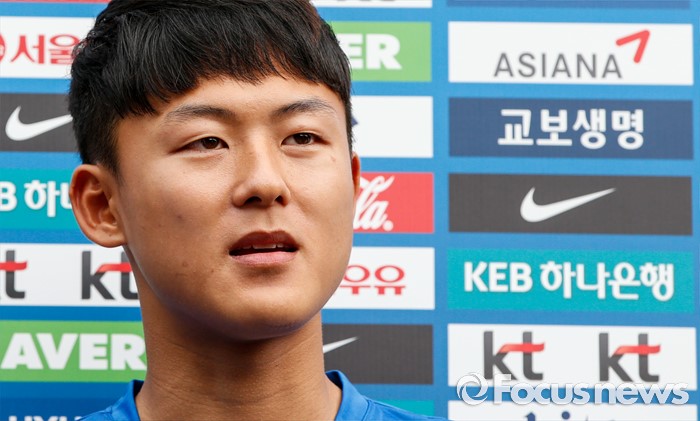 (파주=포커스뉴스) 이승우(18, 바르셀로나 후베닐A)가 25일 오후 경기도 파주 NFC에서 진행된 U-18(18세 이하) 축구대표팀 소집 훈련에 앞서 취재진의 질문에 답하고 있다.