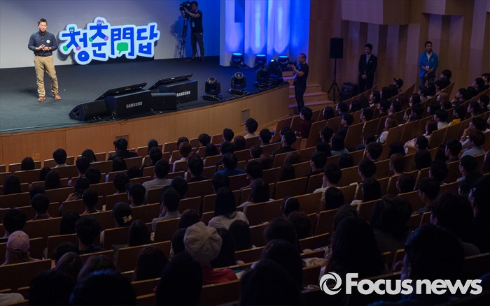 (서울=포커스뉴스) 25일 오후 서울 서대문구 연세대학교에서 열린 삼성 퀴즈 콘서트 '청춘門답'에 참석한 조용범 페이스북코리아 사장이 기조강연을 하고 있다.