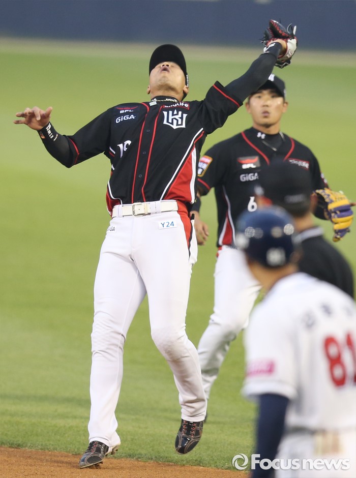 (서울=포커스뉴스) 25일 서울 잠실구장에서 열린 2016프로야구 kt-두산 경기 1회말 kt 1루수 김상현이 두산 박건우의 플라이볼 타구를 잡고 있다.