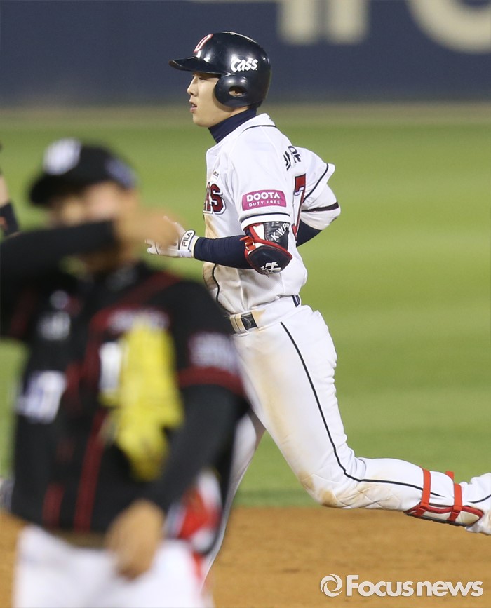 (서울=포커스뉴스) 25일 서울 잠실구장에서 열린 2016프로야구 kt-두산 경기 5회말 1사 1루에서 두산 박건우가 좌월 2점 홈런을 치고 그라운드를 돌고 있다.