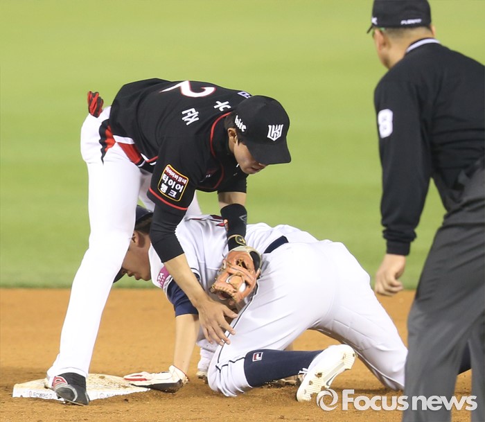 (서울=포커스뉴스) 25일 서울 잠실구장에서 열린 2016프로야구 kt-두산 경기 8회말 2사후 볼넷으로 진루한 두산 정수빈이 오재일 타석때 2루 도루에 성공하고 있다.