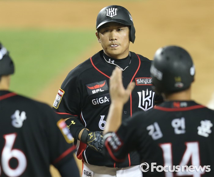 (서울=포커스뉴스) 25일 서울 잠실구장에서 열린 2016프로야구 kt-두산 경기 8회초 1사 1,2루에서 kt 박경수가 좌중월 3점 홈런을 치고 선행주자의 환영을 받으며 홈인하고 있다.