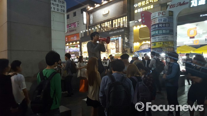 25일 오후 7시30분 서울 마포구 홍대입구역 9번출구 앞에서 '여성혐오 반대 자유발언대'가 시민 20여명이 지켜보는 가운데 열렸다.