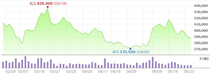이에 따라 농심에 대한 목표주가를 종전 37만5000원에서 39만원으로 상향 조정했다.최근 3개월간 농심 주가 추이 <그래픽출처=네이버>