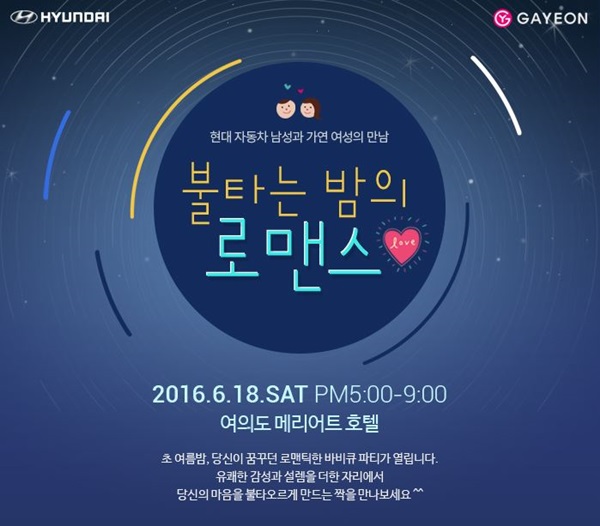 (서울=포커스뉴스) 결혼정보업체 가연은 현대자동차 남성 직원과 가연 여성 정회원이 함께하는 '불타는 밤의 로맨스' 미팅파티를 개최한다고 26일 밝혔다.