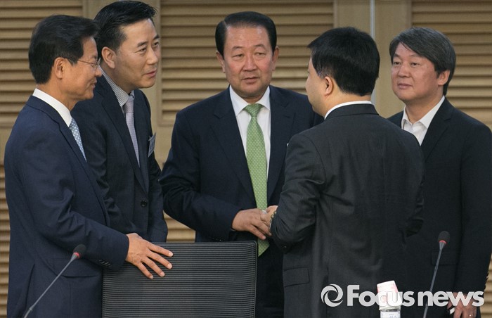 (서울=포커스뉴스) 26일 오전 서울 여의도 국회 의원회관에서 광주 지역경제 활성화와 중국 관광객 유치 방안 포럼에 앞서 참석자들이 대화하고 있다. 오른쪽부터 안철수 국민의당 상임공동대표, 짠위홍 상하이화이연합그룹 회장, 박주선 최고위원, 서영충 한국관광공사 중국마케팅센터장, 천정배 공동대표.