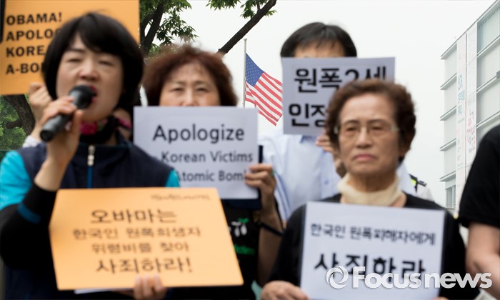 (서울=포커스뉴스) 26일 오전 서울 종로구 광화문 KT 앞에서 한국 원폭피해자와 시민사회단체가 오바마 미국 대통령의 한국 원폭 피해자들에 대한 공식 인정과 조사 및 사죄 촉구 기자회견을 하고 있다.