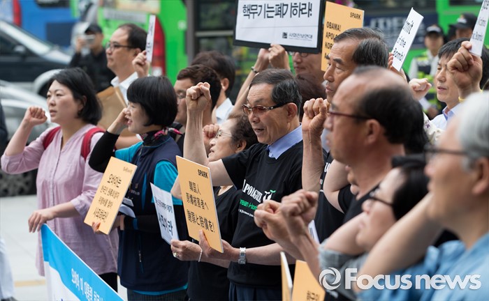 (서울=포커스뉴스) 26일 오전 서울 종로구 광화문 KT 앞에서 한국 원폭피해자와 시민사회단체가 오바마 미국 대통령의 한국 원폭 피해자들에 대한 공식 인정과 조사 및 사죄 촉구 기자회견을 하고 있다.