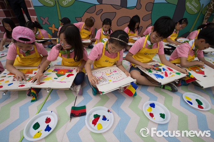 (서울=포커스뉴스) 26일 오전 서울 광진구 어린이대공원에서 열린 굿네이버스 '아프리카 희망학교 체험전'에서 초등학교 학생들이 아프리카에 보낼 가방에 그림을 그리고 있다.