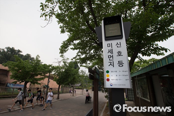 (서울=포커스뉴스) 26일 오전 서울 광진구 어린이대공원에 설치된 미세먼지 신호등에 나쁨 수준인 노란색 불이 켜져 있다.