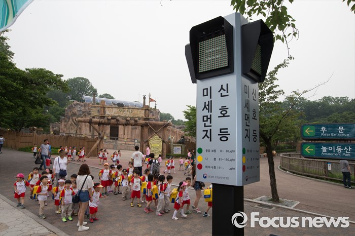 (서울=포커스뉴스) 26일 오전 서울 광진구 어린이대공원에 설치된 미세먼지 신호등에 나쁨 수준인 노란색 불이 켜져 있다.