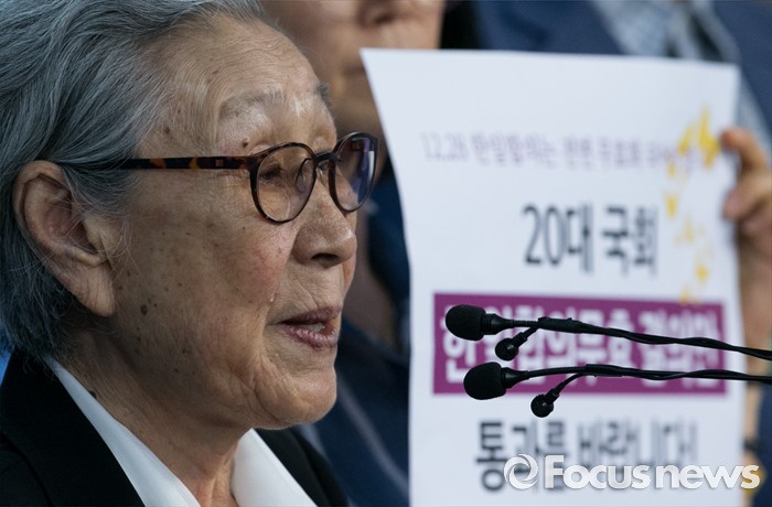 (서울=포커스뉴스) 26일 오전 서울 여의도 국회 정론관에서 홍익표, 이인영 더불어민주당 의원과 윤미향 한국정신대문제대책협의회 상임대표, 위안부 피해자 김복동 할머니 등이 한일 일본군 '위안부' 합의 무효 및 재협상을 위한 20대 국회의 역할 촉구 기자회견을 하고 있다.