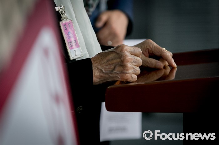 (서울=포커스뉴스) 26일 오전 서울 여의도 국회 정론관에서 홍익표, 이인영 더불어민주당 의원과 윤미향 한국정신대문제대책협의회 상임대표, 위안부 피해자 김복동 할머니 등이 한일 일본군 '위안부' 합의 무효 및 재협상을 위한 20대 국회의 역할 촉구 기자회견을 하고 있다.